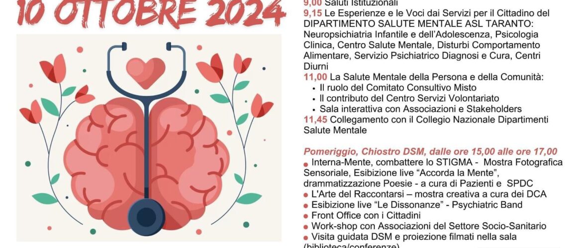 Oggi la Giornata Mondiale della Salute Mentale. Il Dipartimento di Salute Mentale della ASL di Taranto organizza un open day all’ospedale vecchio, in via SS. Annunziata, per sensibilizzare sul tema e informare sui servizi territoriali e l’offerta assistenziale.