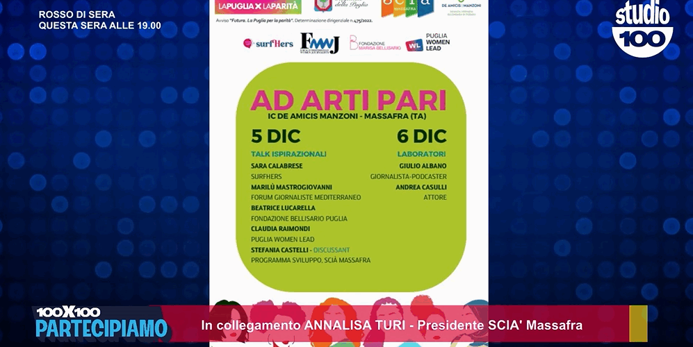 “Ad Arti Pari” è alla sua seconda edizione. L’iniziativa dell’associazione “Scià Massafra” è vincitrice del bando regionale “Futura. La Puglia per la parità”.