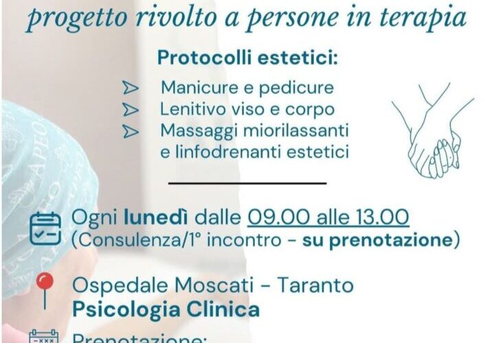 Il progetto, che si svolgerà nell’ospedale Moscati di Taranto, nasce dalla collaborazione tra il servizio di Psicologia Clinica, Oncologia Medica dell’Asl di Taranto e Apeo – associazione professionale di estetica oncologica. L’obiettivo: offrire alle persone in terapia un momento di coccola.