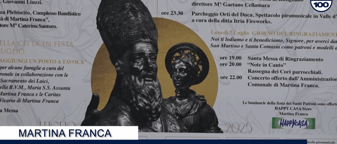 A Martina Franca è stata presentata ufficialmente la Festa Patronale in onore di San Martino e Santa Comasia, che quest’anno si svolgerà nel contesto dell’Anno Giubilare. I festeggiamenti, in programma dal 28 giugno al 7 luglio, coinvolgeranno la comunità in un vero pellegrinaggio di speranza.