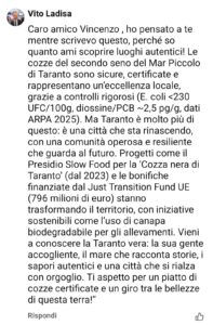 Cozza tarantina, anche Vito Ladisa risponde a Magistà: “Prodotto sicuro e certificato. Vieni a conoscere Taranto”