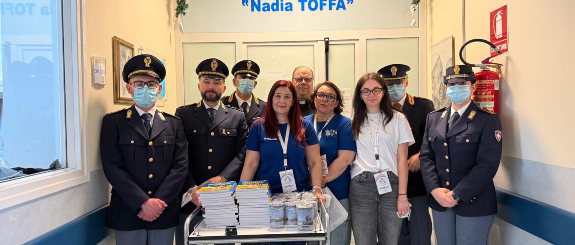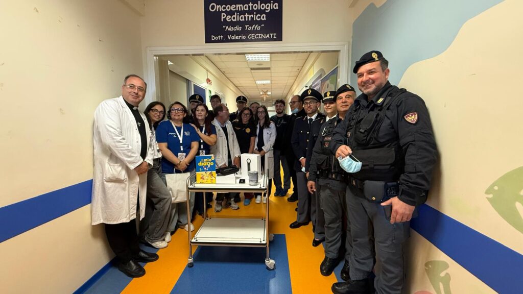 Alla consegna erano presenti il dirigente del reparto, dottor Antonio Gaetani, il cappellano provinciale don Santo Guarino, il funzionario medico e una delegazione della Polizia di Stato. L’iniziativa è stata realizzata con il contributo dell’AGTOE (Associazione Genitori Taranto Oncoematologia).